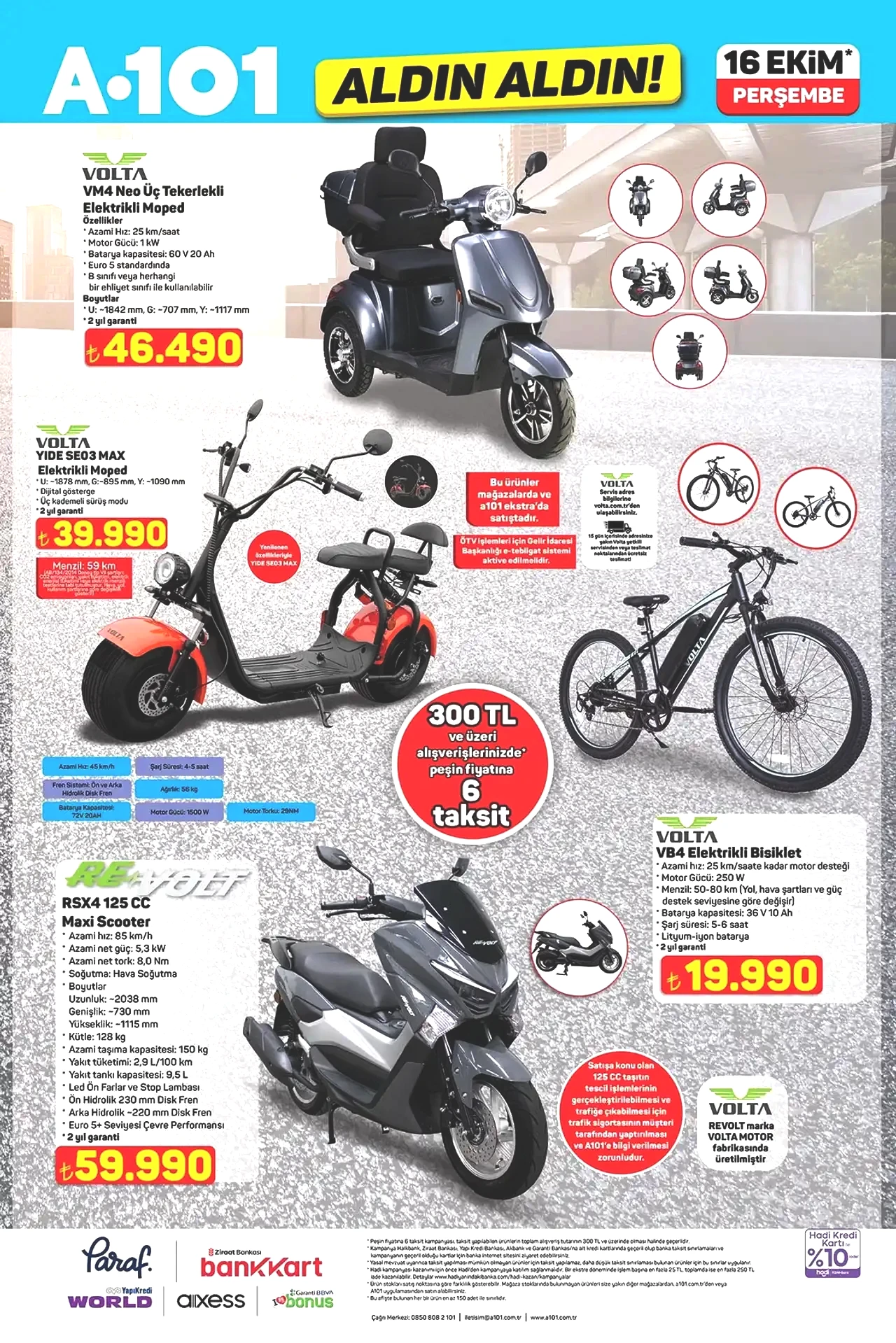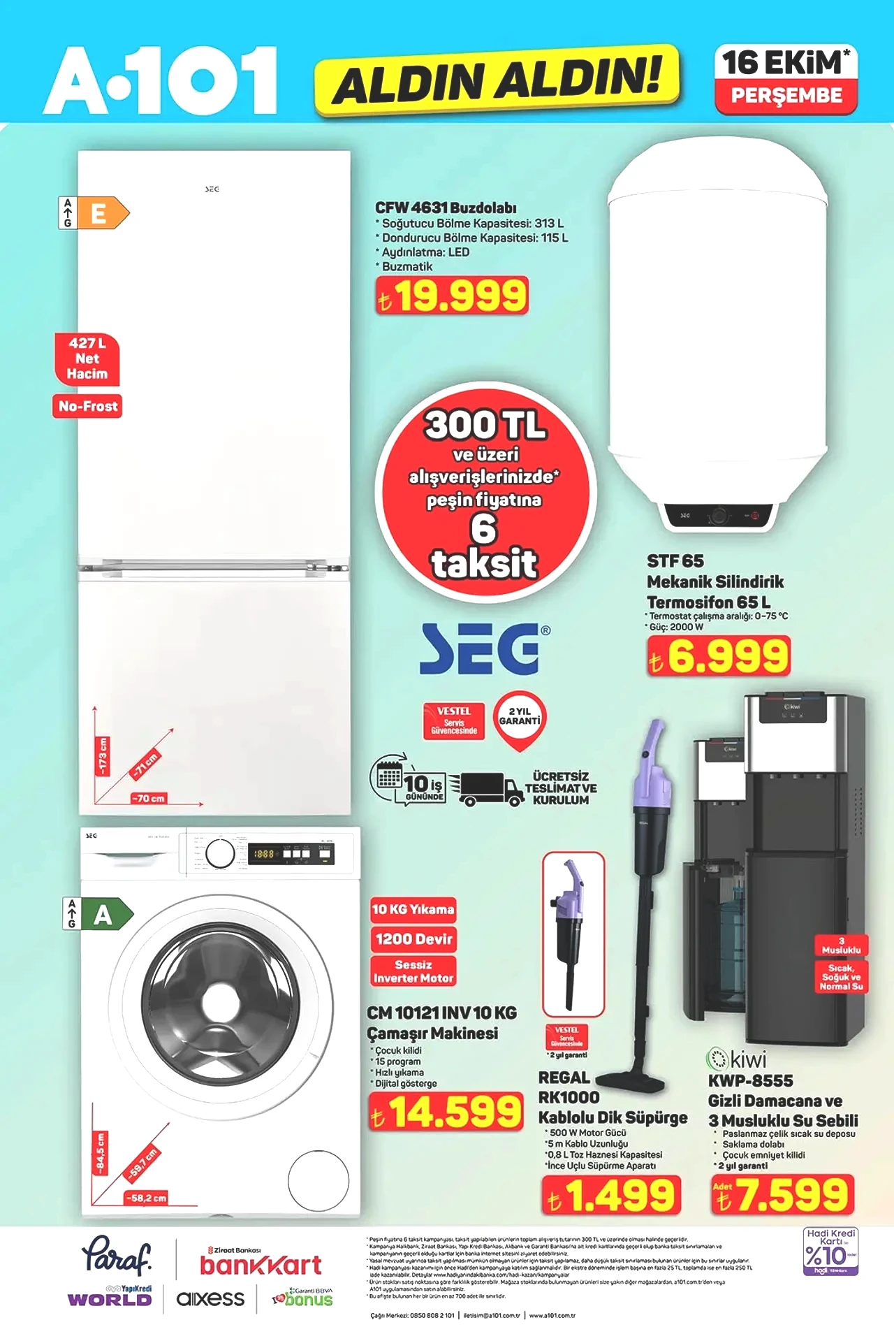 A101 Aktüel kataloğunda harika televizyon fırsatlarıyla yola çıkılıyor. Her gelir grubuna hitap eden modeller arasında Toshiba 65” televizyon, 24999 TL’ye satışta. Philips 55” akıllı TV de 21999 TL’den sizleri bekliyor. Fobem 50” TV ise sınırlı stokları ile 11999 TL gibi cazip bir fiyatla sunuluyor. 40” Onvo TV 7499 TL ve son olarak Hi-Level 32” TV de 5499 TL’den raflarda yer alacak. A101 Aktüel kataloğunda bu perşembe ihtiyacınız olan televizyonu uygun bir fiyatla bulmanız oldukça mümkün. İncelemede yer alan ilk sayfanın devamında Piranha markasına ait üç farklı ürün sıralanıyor. Bunlar kablosuz standlı masa lambası, powerbank ve kulaklık olarak karşımıza çıkıyor. A101 Aktüel’in ikinci sayfasında beyaz eşya kategorisinde SEG markalı buzdolabı, çamaşır makinesi, süpürge ve su sebili dikkat çekiyor. Üçüncü sayfada elektrikli mopedler, maxi scooter ve elektrikli bisiklet gibi araçlar yer alıyor. Bu ürünler 6 taksit fırsatı ile birlikte oldukça uygun fiyatlara sunulmakta. A101 16 Ekim 2025 kataloğunun dördüncü sayfasında yapı market ürünleri dikkat çekiyor. Piranha’dan gelen birçok ihtiyaç için uygun fiyatlı ürünler arasında titreşimli zımpara makinesi, sıcak hava tabancası ve 110 parçadan oluşan hobi seti bulunuyor. Dekupaj testere 799 TL, şarjlı lazer metre 999 TL, avuç taşlama ise 799 TL gibi fiyatlarla sunulmakta. Ayrıca şarjlı vidalama, lehim havya seti ve profesyonel şarjlı vidalama seti gibi ürünler de aktüel listede yer almakta. 300 TL ve üzeri alışverişlerde 6 taksit/peşin avantajı sunan A101, el arabasını 1149 TL, katlanabilir taşıma arabasını ise 2999 TL’den mevcut durumda satışa çıkarıyor.