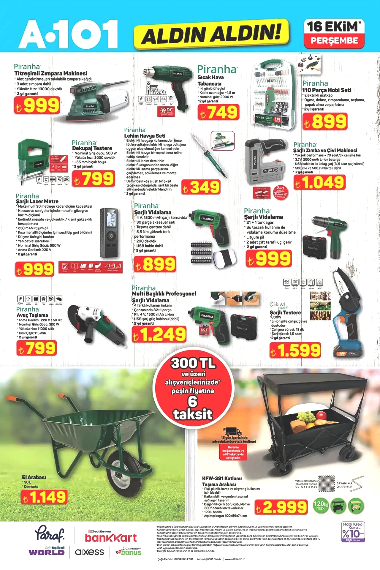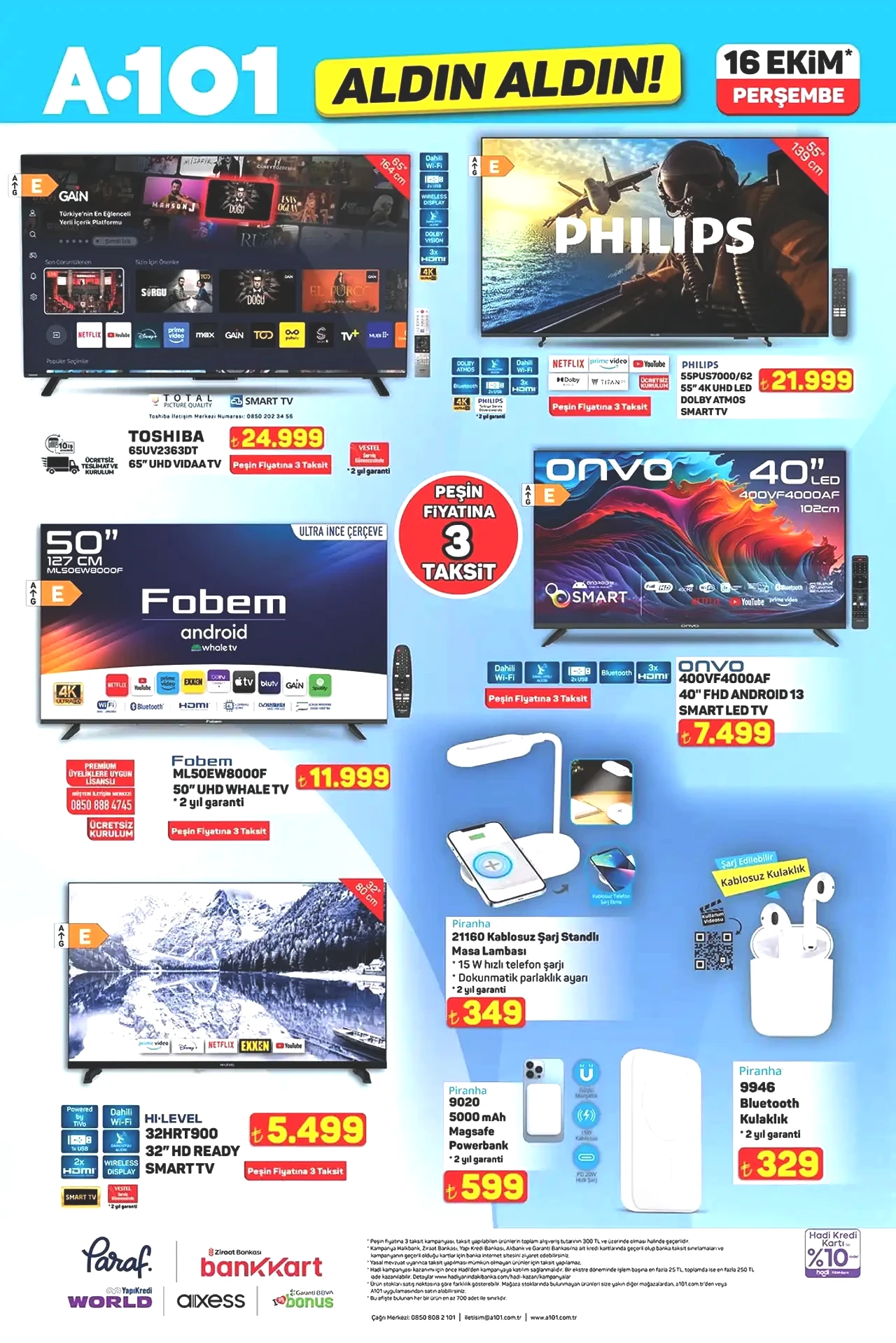 A101 Aktüel kataloğu, televizyonlarla dolu heyecan verici fırsatlarla başlıyor. Her bütçeye hitap eden TV modelleri arasında Toshiba 65” ekran, 24999 TL’den satışa sunuluyor. Bunun yanı sıra, Philips'in 55” akıllı TV modeli ise 21999 TL’den satın alınabilir. Stokları sınırlı olan A101'de aynı zamanda Fobem 50” TV, 11999 TL’ye, Onvo’nun 40” TV modeli ise 7499 TL’ye raflarda yer alıyor. Son olarak, Hi-Level 32” TV, 5499 TL fiyatıyla dikkat çekiyor. A101 Aktüel katalogları bu perşembe, aradığınız TV modelini uygun fiyatlarla bulma fırsatını sunuyor. Aktuel-urunler.com üzerindeki incelemelere göre, ilk sayfanın devamında Piranha markasına ait üç farklı ürün daha yer alıyor. Bunlar; kablosuz standlı masa lambası, powerbank ve kulaklık şeklinde sıralanıyor. A101 Aktüel'in ikinci sayfasında ise beyaz eşya seçenekleri bulunuyor. SEG markasından buzdolabı, çamaşır makinesi, elektrikli süpürge ve su sebili sizi bekliyor. Üçüncü sayfada elektrikli mopedler, maxi scooter ve elektrikli bisikletler, uygun fiyat avantajlarıyla öne çıkıyor. Bu araçlar, sundukları 6 taksit imkânı ile de oldukça cazip çözümler sağlıyor. A101 16 Ekim 2025 kataloğunun dördüncü sayfasında ise yapı market ürünleri sıralanıyor. Piranha’nın sunduğu fırsatlar arasında, titreşimli zımpara makinesi, sıcak hava tabancası ve 110 parça hobi seti dikkat çekiyor. Katalogda fiyatlarının oldukça uygun olduğunu görmekteyiz; dekupaj testere 799 TL’den, şarjlı lazer metre 999 TL ve avuç taşlama ise 799 TL’ye satılmakta. Ayrıca, şarjlı vidalama, lehim havya seti, profesyonel şarjlı vidalama seti ve şarjlı testere gibi ürünler de aktüel ürünler arasında yer alıyor. A101, 300 TL ve üzeri alışverişlerde 6 taksit/peşin fırsatının yanı sıra, bu hafta el arabasını 1149 TL’den, katlanabilir taşıma aracını ise 2999 TL’den sunuyor.