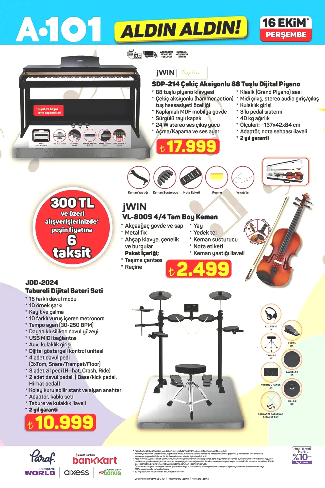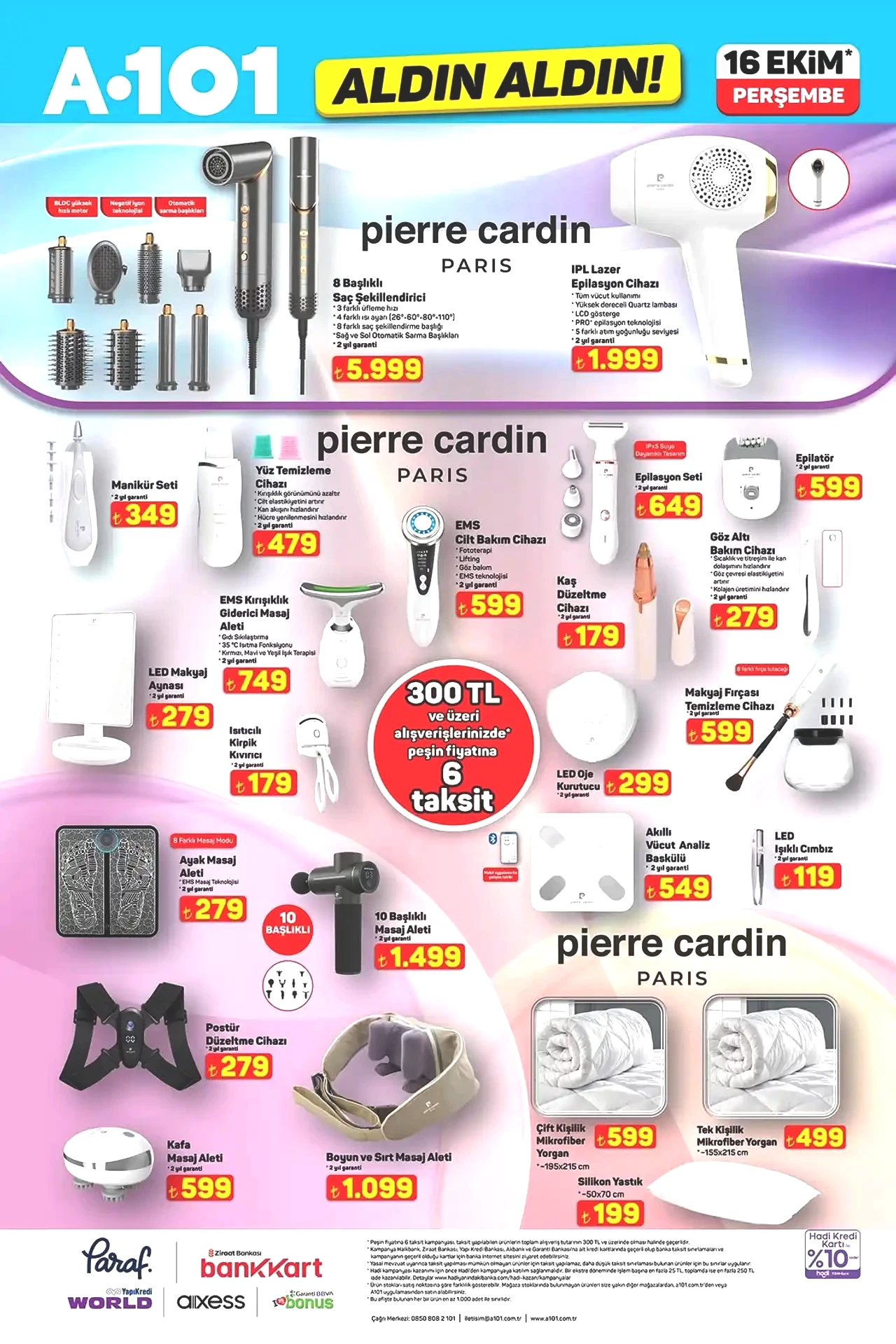 16 Ekim 2025 A101 Aktüel kataloğu hızla sayfalarını çeviriyor ve indirimler büyük bir heyecan yaratıyor. A101'in altıncı fırsat sayfasında Piere Cardin Paris markasına ait dikkat çekici fırsatlar sıralanıyor. İlk ürün, 8 başlıklı saç şekillendirme aracı 5999 TL’den satılıyor. Ayrıca, IPL epilasyon cihazı 1999 TL fiyatıyla sizleri bekliyor. Aynı markaya ait birçok kişisel bakım elektroniği de sayfada yer alıyor. Manikür seti, yüz temizleme cihazı, LED makyaj aynası, kirpik kıvırıcı, kırışıklık giderici masaj aleti, cilt bakım cihazı, epilasyon cihazı, epilatör, göz altı bakım cihazı, kaş düzeltme aracı, oje kurutucu, cımbız gibi ürünler hepsi Piere Cardin Paris markasına ait ve oldukça uygun fiyatlarla raflarda! Üstelik, 300 TL ve üzeri alışverişlerde peşin fiyatına 6 taksit olanağı da mevcut. İlgili sayfanın devamında ayak masaj aleti, 10 başlıklı masaj aleti, postür düzeltme cihazı, kafa masaj aleti ve boyun ile sırt masaj aletleri uygun fiyatlarla A101'de! Ayrıca çift ve tek kişilik seçenekleriyle mikrofiber yorganlar da yine aynı markadan sizlerle buluşmakta. A101 16 Ekim 2025 kataloğunun altıncı sayfasında tekstil ürünleri, oyuncaklar, düzenleyiciler gibi birçok ürün yelpazesi sunuluyor; yedinci sayfada ise mutfak aletlerine yer veriliyor. Uygun fiyatlarla birçok indirim sunan A101; sekizinci sayfada piyanoları da gösteriyor. Piyanonun 17999 TL fiyatının yanı sıra, tam boy keman 2499 TL ve tabureyle birlikte dijital bateri seti 10999 TL’den sizleri bekliyor. Dokuzuncu aktüel katalog sayfasında oyuncaklar, onuncu sayfada ise terlikler yer alarak fırsatları daha da büyütüyor. 11., 12. ve 13. sayfalarda ise A101 Aktüel 16 Ekim 2025 kataloğu temel tüketim ve atıştırmalık ürünlerini sıralıyor. Daha fazlası için A101 fırsatlarını incelemek üzere a101.com.tr'yi ziyaret etmeyi unutmayın. Ayrıca, sayfanın ilerleyen bölümlerinde sizlere aktüel katalogları da sunuyoruz. Yeni haftayla ilgili düşünceleriniz nedir, indirimler sizce yeterli mi?