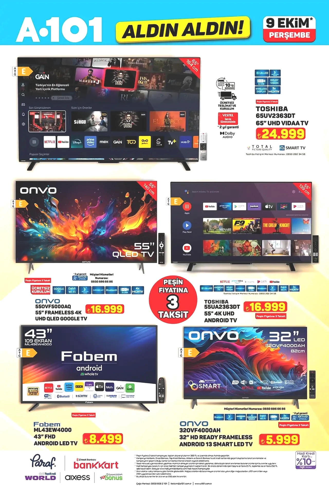 A101 Aktüel kataloğu, geleneksel perşembe alışveriş deneyiminizi zenginleştirecek yenilikçi fırsatlar getiriyor. A101 9 Ekim 2025 kataloğunun ilk sayfasında dikkat çeken indirimler arasında televizyonlar öne çıkıyor. 65 inç Toshiba televizyon, katalogda 24.999 TL olarak yer alırken, aynı markanın 55 inç modeli 16.999 TL fiyatla satışa sunuluyor. Onvo'nun 55 inç akıllı televizyonu da 16.999 TL fiyatıyla dikkat çekiyor. Ek olarak, Fobem markasına ait 43" ekran TV için 8.499 TL, 32” Onvo TV içinse 5.999 TL olarak belirtilen fiyatlar mevcut. A101 Market, peşin fiyatına sağlanan 3 taksit imkanı ile herkesin bütçesine hitap eden çeşitli televizyon modellerini müşterileriyle buluşturuyor. Beyaz eşya kategorisinde ise SEG'nin bulaşık makinesi, buzdolabı ve çamaşır makineleri, nadir rastlanan avantajlı fiyatlarla peşin fiyatına 6 taksit imkanı sunarak dikkat çekiyor. A101 9 Ekim 2025 kataloğu, elektrikli ürünleri de kapsayarak ihtiyacınız olabilecek pek çok ürünü fırsat reyonlarına dahil ediyor. Örneğin, tam otomatik kahve makinesini düşünüyorsanız, Onvo’nun OVCM02 modeli 14.999 TL’den satışa sunuluyor. Filtre kahve makinesi arayanlar için aynı marka tarafından 1.399 TL’den satılan bir ürün bir fırsat niteliği taşıyor. Ayrıca bu hafta, Schafer markasına ait Çaykeyfi çay makinesi 1.399 TL’den, stand mikser, el blender seti, ultrasonik hava nemlendirici, otomatik narenciye sıkacağı, kişisel bakım seti, iyonik saç kurutma makinesi, dijital baskül, koltuk ve halı yıkama makineleri ile şarjlı dikey süpürge yine 9 Ekim perşembe günü sizlerle birlikte olacak.