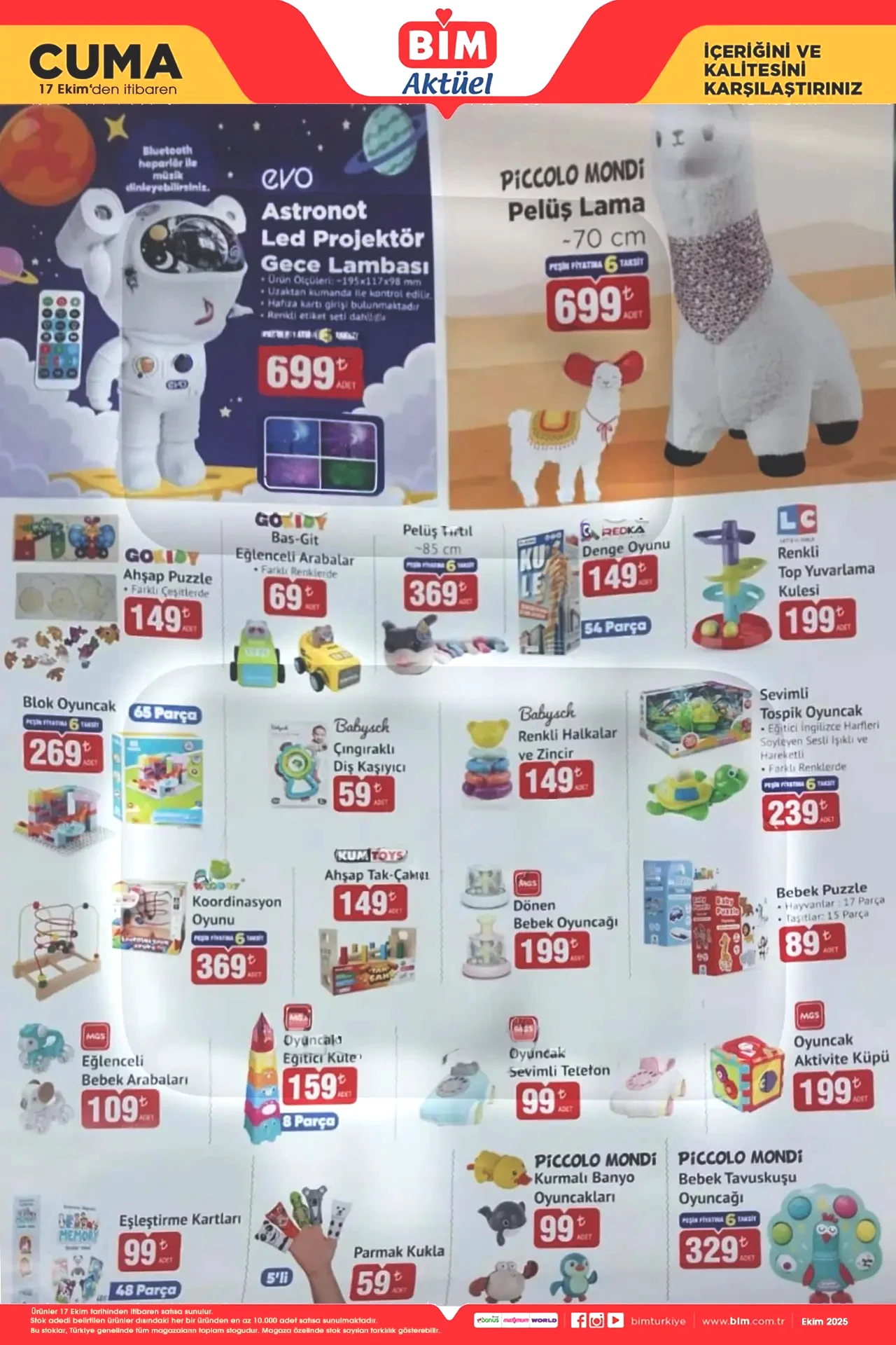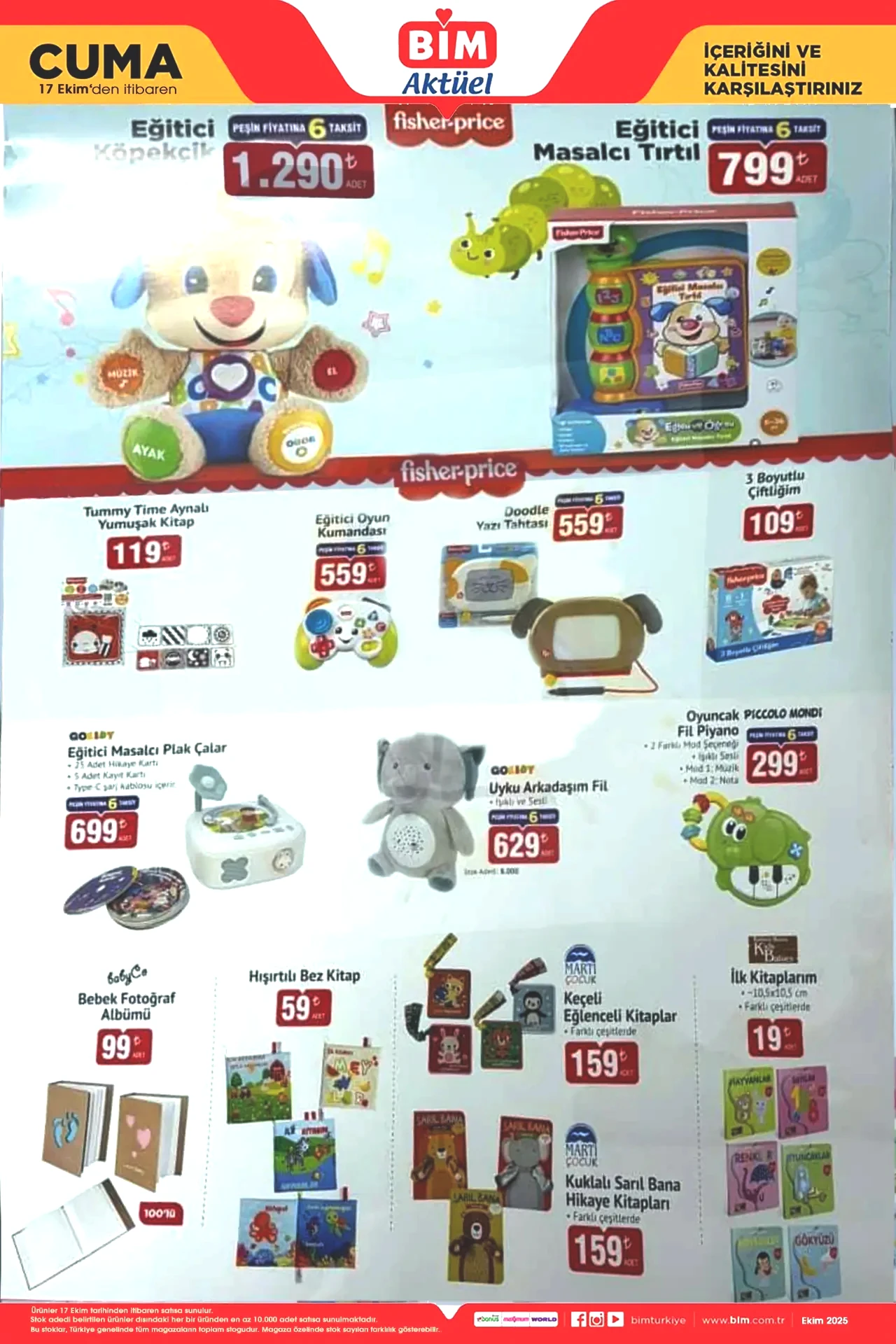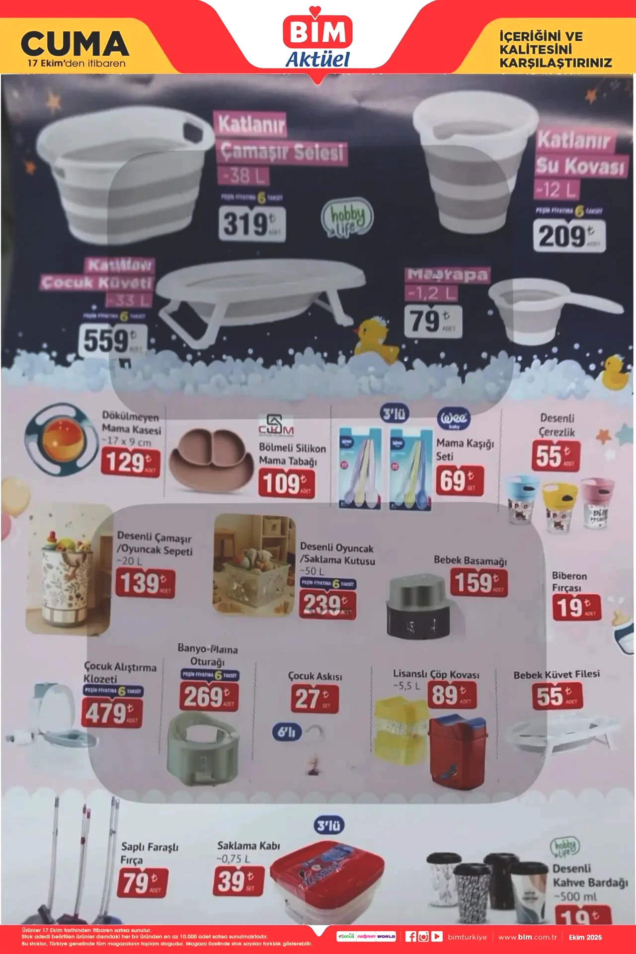 Bu katalogda bu hafta tek fiyat çelik ürünler 319 TL'lik fiyatıyla yer alacak. Mutfak ekipmanlarından ise çeşitli cam ürünler ile birlikte kaseler, tabaklar ve bardaklar da göze çarpıyor. Bim Aktüel 17 Ekim kataloğu beşinci sayfasında bebek ürünleri de unutulmamış. Katlanır çamaşır selenin yanı sıra, katlanır su kovası ve çocuk küveti de fırsatlar arasında. Dökülmeyen mama kasesi 129 TL’den satılırken, mama kaşığı seti bu hafta 69 TL’ye alınabilir. Çocuk alıştırma klozeti, lisanslı çöp kovası ve biberon fırçası gibi ürünler de bebek bakımına yönelik seçeneklerle sıralanıyor. Bim Kataloğunun altıncı sayfasında ise eğitici ve öğretici birçok oyuncak dikkat çekiyor. Bu hafta, Fisher Price markasından birçok fırsat ürünü kampanya raflarında yer alıyor. Fisher Price’ın sevilen eğitici köpekçik oyuncak fiyatı 1290 TL olarak satışa sunulacak. Bunun dışında uyku arkadaşı, yazı tahtası ve bebek fotoğraf albümü gibi seçenekler de mevcut.