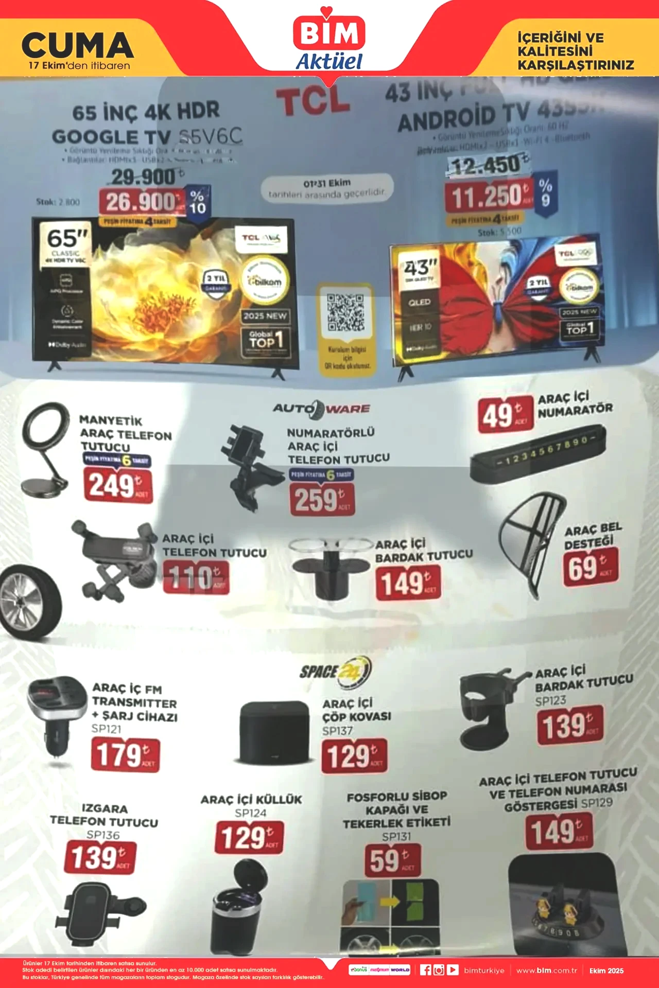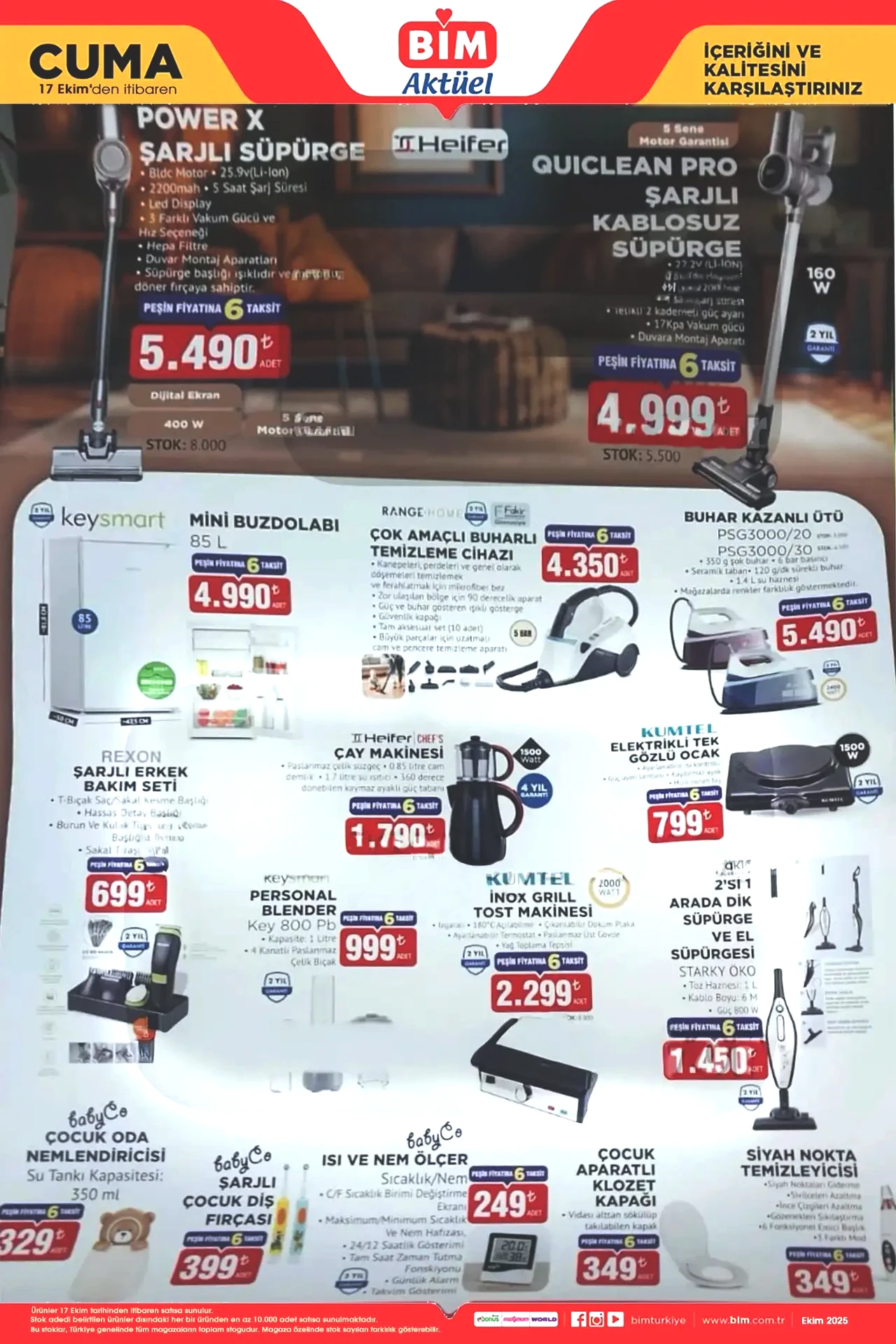 BİM, her hafta alışveriş için en cazip adreslerden biri olmaya devam ediyor. Bu haftaki 17 Ekim 2025 kataloğu da bu fırsatların yer aldığı yeni bir sürüm. İçinde nelerin bulunduğunu merak ediyorsanız, gelin birlikte göz atalım: İlk sayfada yer alan Heifer ürünlerine bir bakalım. Power X şarjlı süpürgenin fiyatı nihayet 5490 TL olarak belirlendi. Stok adedi 8000 ile sınırlı olan bu ürünü, 5500 adetle satışa sunulacak olan Quiclean Pro şarjlı kablosuz süpürge ise 4999 TL'ye satın alabilirsiniz. Keysmart mini buzdolabı 4.990 TL'lik fiyatıyla raflarda yerini alırken, bu hafta ayrıca şarjlı erkek bakım seti 699 TL’ye satışta olacak. Çay makinesi fiyatı 1.790 TL olarak belirlenirken, kişisel blender bu kataloğun 999 TL'lik fiyatıyla müşterileri bekliyor. Ayrıca tost makineleri, elektrikli tek gözlü ocaklar ve buhar kazanlı ütüler gibi ürünler de uygun fiyatlarla sizleri bekliyor. Çocuklar için şarjlı diş fırçası, nemlendirici ve ısı-nem ölçer gibi çeşitli ürünlerin yanı sıra, çocuklara özel klozet kapağında da cazip fiyatlar mevcut. Cuma fırsat kataloğunda bulunacak siyah nokta temizleyici ise 349 TL olarak raflarda yer alacak. BİM 17 Ekim 2025 Kataloğu'nun ikinci sayfasında ise televizyonlar ve çok sayıda araç gereci sıralanıyor. TCL markasından gelecek ve ekim ayı boyunca geçerli olacak indirimlerle birlikte iki farklı televizyon sınırlı stokta satışa sunulacak.