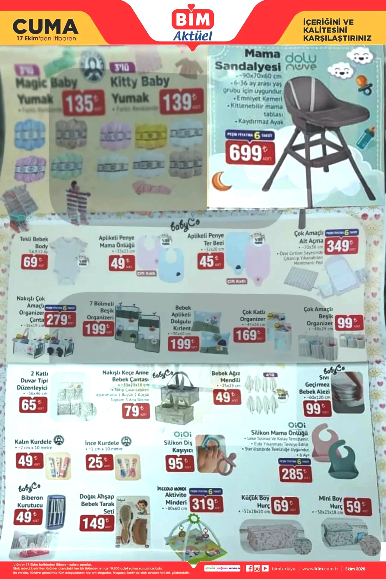BİM Aktüel kataloğunda indirimler bu hafta sayfalarca sürecek. Bim kataloğunun yedinci aktüel sayfasında ise hem bebek ürünleri hem de mama sandalyesi için fırsatlar yer alıyor. Yumaklar Ören Bayan markasından geliyor. Mama sandalyesinin fiyatı 699 TL olarak belirlendi. Ayrıca ter bezi, mama önlüğü, çok amaçlı alt açma yüzeyi ve tekli bebek body'ler de raflarda yer buluyor. Nakışlı çok amaçlı organizer çanta, bebek aplikeli dolgulu kırlent ve çok amaçlı beşik organizerinde de indirimli seçenekler bulunuyor. 17 Ekim fırsatlarında bu hafta OiOi markasından silikon diş kaşıyıcı 95 TL’ye satın alınabilir. Ayrıca sıvı geçirmez bebek alezi, silikon mama önlüğü, ufak boy hurç ve aktivite minderi gibi ihtiyaçlara yönelik ürünlerde de önemli indirimler bulunuyor. Ayrıca: Bim 17 Ekim kataloğu 8. sayfasında bebeklere yönelik oyuncaklar satışa sunulacak. Astronot led projektör gece lambası 699 TL’den ve peluş lama 70 cm boyunda 699 TL’den satılacak. Puzzle, LC renkli top yuvarlama kulesi, koordinasyon oyunu, kurmalı banyo oyuncakları ve parmak kuklaları da indirimli fiyatlarıyla listeye ekleniyor. Aktüel tablo ekranlarında görebileceğiniz gibi, BİM bu hafta dolu dolu bir indirim broşürü sunuyor. Görsellere devam eden sayfadan ulaşabilirsiniz. Daha fazla bilgi için bim.com.tr'yi ziyaret etmeyi unutmayın. Güzel günler dileriz.
