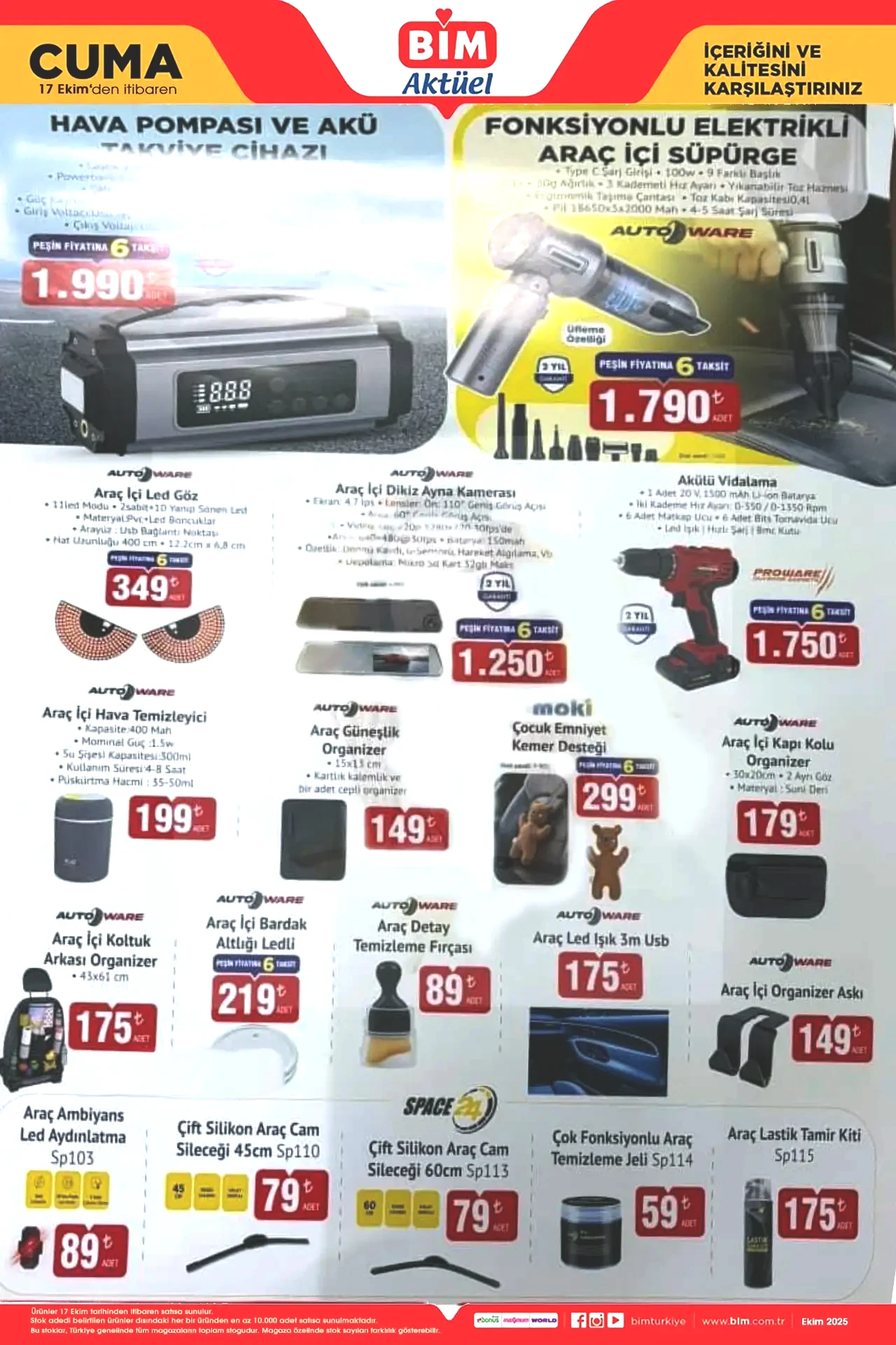 BİM 17 Ekim 2025 kataloğunun 3. sayfasında neler var diye bakarsak, çeşitli indirimlere ulaşma fırsatını yakalıyoruz. Hava pompası ve akü takviye cihazları 1.990 TL'den satışa sunulurken, çok fonksiyonlu elektrikli araç içi süpürge 1.790 TL'ye alıcıları bekliyor. Arat itü gözlük ise 349 TL fiyatıyla raflarda yer alacak. Ayrıca araç içi hava temizleyici 199 TL'den satılacak. Araç içi dikiz ayna kamerası fiyatı 1.250 TL olarak belirlenirken, fırsat reyonunda akülü vidalama 1.750 TL'ye sunulacak. Araç için güneşlik organizer, çocuk emniyet kemeri desteği ve detay temizleme fırçası gibi ürünler de önemli fırsatlar ile dikkat çekiyor. Otomobil meraklıları ve bakımına özen gösterenler için BİM Mağazaları, 17 Ekim 2025 tarihinde heyecan verici indirimler sunacak. Ayrıca, BİM 17 Ekim 2025 kataloğunun 4. sayfası da fırsatlarla devam ediyor.