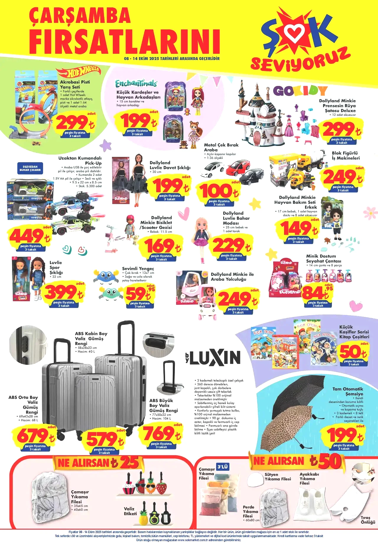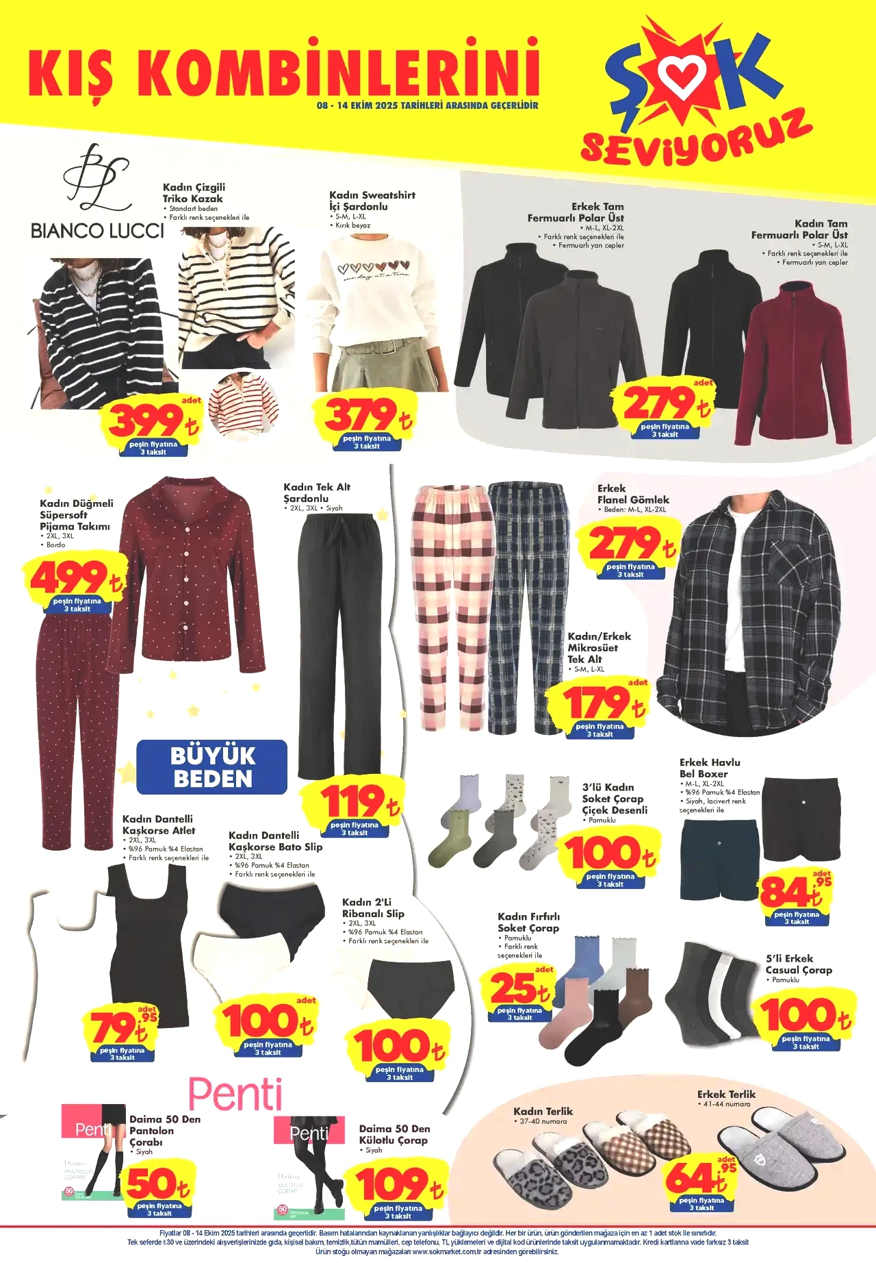 Şok 8 Ekim 2025 kataloğu, kış aylarında kombinlerinize indirimli fiyatlar sunacak. Bianco Lucci markasından kadın çizgili triko kazanlar 399 TL’den satışa sunulacak. Kadın sweatshirt içi şardonlu ürünler ise 379 TL fiyatla dikkat çekiyor. Erkekler için flanel gömlek 279 TL’den müşterilere sunulurken, erkek/kadın tam fermuarlı polar üst de 279 TL’den sizleri bekliyor. Büyük beden kadın düğmeli süper soft pijama takımı 499 TL, kadın tek alt şardonlu ise 119 TL’den satışa sunulacak. Ayrıca, bu haftaki özel fiyatlar iç çamaşırları ve çoraplarda da mevcut; terliklerin fiyatı ise 64,95 TL olarak belirlenmiş. 8 Ekim 2025 Şok aktüel katalogları, çocukların yüzünü güldürecek oyuncaklarla dolup taşıyor; Hotwheels ve Enchantimals gibi pek çok lisanslı ürün uygun fiyatlarla kampanyaya dahil ediliyor. Ayrıca, gümüş renkten oluşan kabin boy, orta boy ve büyük boy valiz çeşitleri de oldukça uygun fiyatlarla sizlere sunulacak. Tam otomatik şemsiye 199 TL fiyatla 8 Ekim 2025 Şok kataloğunda yer alırken; 25 TL ve 50 TL indirim grubu ile ilgili ürünler görsellerde yer alacak. Bunun yanı sıra, Şok Aktüel katalogları, temel temizlik ve gıda ürünlerinde de indirim fırsatları sunuyor. İhtiyacınız olan fırsatları Şok kataloglarında bulabilir, 8 Ekim 2025 Çarşamba günü satın alabilirsiniz. Öncelikle görselleri sizlere sunalım ve bu haftayı kapatalım.