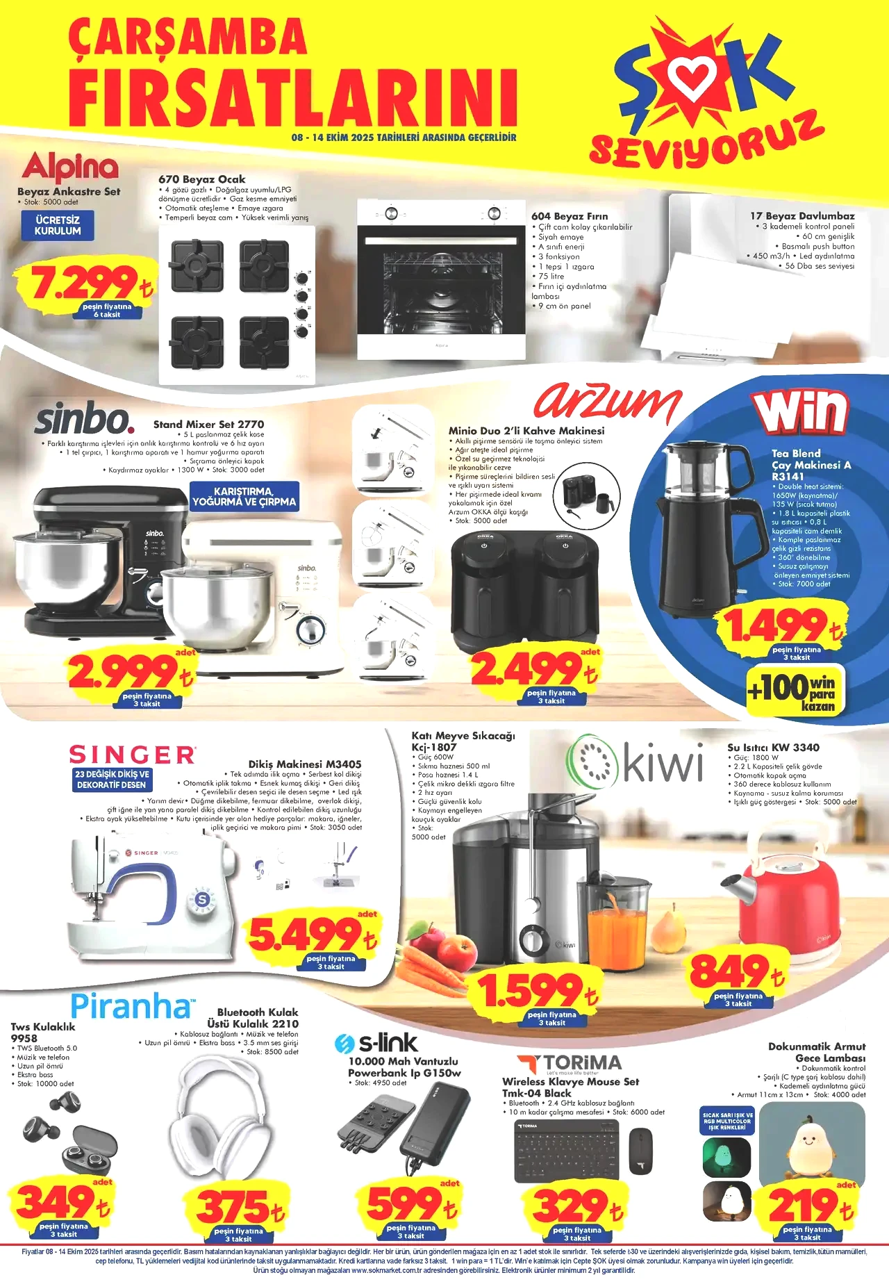 ŞOK Market, 8 Ekim 2025 tarihli kataloğunda kışa uygun kombinler, oyuncaklar, kış hazırlık ürünleri ve ev elektroniği ile dolup taşıyor. Haftanın en dikkat çeken ürünleri arasında alpina beyaz ankastre set, 7.299 TL fiyatıyla peşin alımda 6 taksit seçeneğiyle sunuluyor; 3 farklı bileşeni ile kalite sunan bu ürün dikkat çekiyor. Sinbo marka stand mikser setinin fiyatı ise 2.999 TL olarak belirlendi ve bu ürün karıştırma, yoğurma ve çırpma işlevlerini bir arada barındırıyor. Arzum’un 2'li Minio kahve makinesi, 2.499 TL’den satışta bulunurken, +100 Wim kazandıran Tea Blend çay makinesi ise 1.499 TL’den müşterilere ulaşıyor. Singer marka dikiş makinesi, 23 farklı dikiş ve dekoratif desen seçeneğiyle 5.499 TL'den satılıyor. Kiwi'nin katı meyve sıkacağı ve su ısıtıcı fiyatları sırasıyla 1.599 TL ve 849 TL ile raflarda yer alacak. Piranha'nın kulaklık ürünleri uygun fiyatlarla sunulacakken, powerbank, klavye, mouse setleri ve dokunmatik armut gece lambası da dikkat çeken fırsatlardan bazıları arasında. İlk indirim sayfası sonrasında, Şok aktüel kataloglarında kış mevsiminin varlığı belirginleşmiş durumda. Bu bağlamda, dikey ısıtıcı, quartz ve fanlı ısıtıcı çeşitleri ŞOK 8 Ekim 2025 kataloğunun vazgeçilmezleri arasında yer alıyor. Sinbo termostatlı yağlı radyatör ise 7 dilimlik seçeneğiyle 1.899 TL’den satışa sunuluyor. Ayrıca, bu haftaki uygun fiyatlarla Philips erkek bakım seti, saç kurutma makinesi, pilli temizlik fırçası ve şarjlı tiftik makinesi müşterilere sunulacak. Win avantajlarıyla gelen 3 farklı ürün, hem fiyat düşürüyor hem de kazandırıyor: Pirantech beyaz buharlı temizlik makinesi 4.799 TL ve +500 Win kazanma fırsatı ile, Kiwi'nin koltuk ve halı yıkama makinesi 3.999 TL ve +100 Win ile, RANGE vektör dikey süpürge ise +100 Win avantajıyla 1.199 TL’den satılacak.