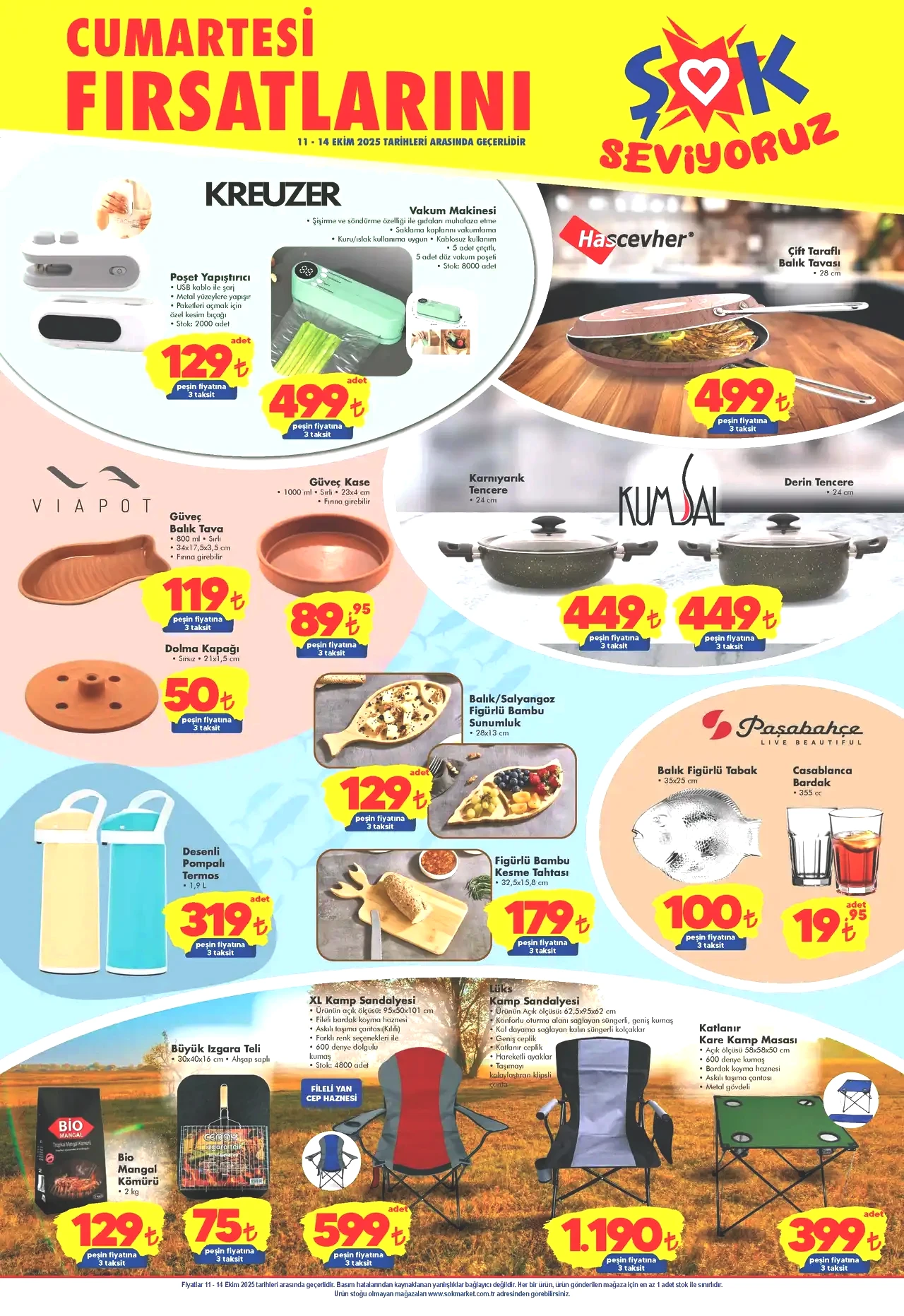 ŞOK 11 Ekim 2025 aktüel kataloğunun ikinci sayfası, etkileyici fiyatlar ve ürün çeşitliliği ile dolu. Öncelikle Kreuzer markasından iki farklı ürüne göz atalım: Birinci üründe poşet yapıştırıcı mevcut ve 129 TL’den alıcıları bekliyor. Diğer üründe ise vakum makinesi var ve fiyatı 499 TL. Balık sezonunun açılmasıyla birlikte, Hascevher’in çift taraflı balık tavası da 499 TL’den raflarda yer buluyor. Viapot markasının güveçlerinde de dikkat çekici indirimler mevcut. Kumsal tencereleri, 449 TL’den satışa sunulmuşken, desenli pompalı termos 319 TL fiyatlandırılmış. Balık desenli sunumluklar, balık figürlü tabaklar ve daha fazlası… Şok Aktüel, bu hafta oldukça avantajlı fırsatlar sunmakta. Ek olarak, iki çeşit kamp sandalyesi, ızgara teli ve kamp masası gibi ürünlerle sonbahar kampına uygun fiyatlar getiriliyor. Daha fazla bilgi için resmi web adresi olan sokmarket.com.tr’yi ziyaret edebilir, sayfanın devamında yer alan görsellere ve sizler için oluşturduğumuz aktüel fiyat listesini inceleyebilirsiniz. Güzel günler dileriz.