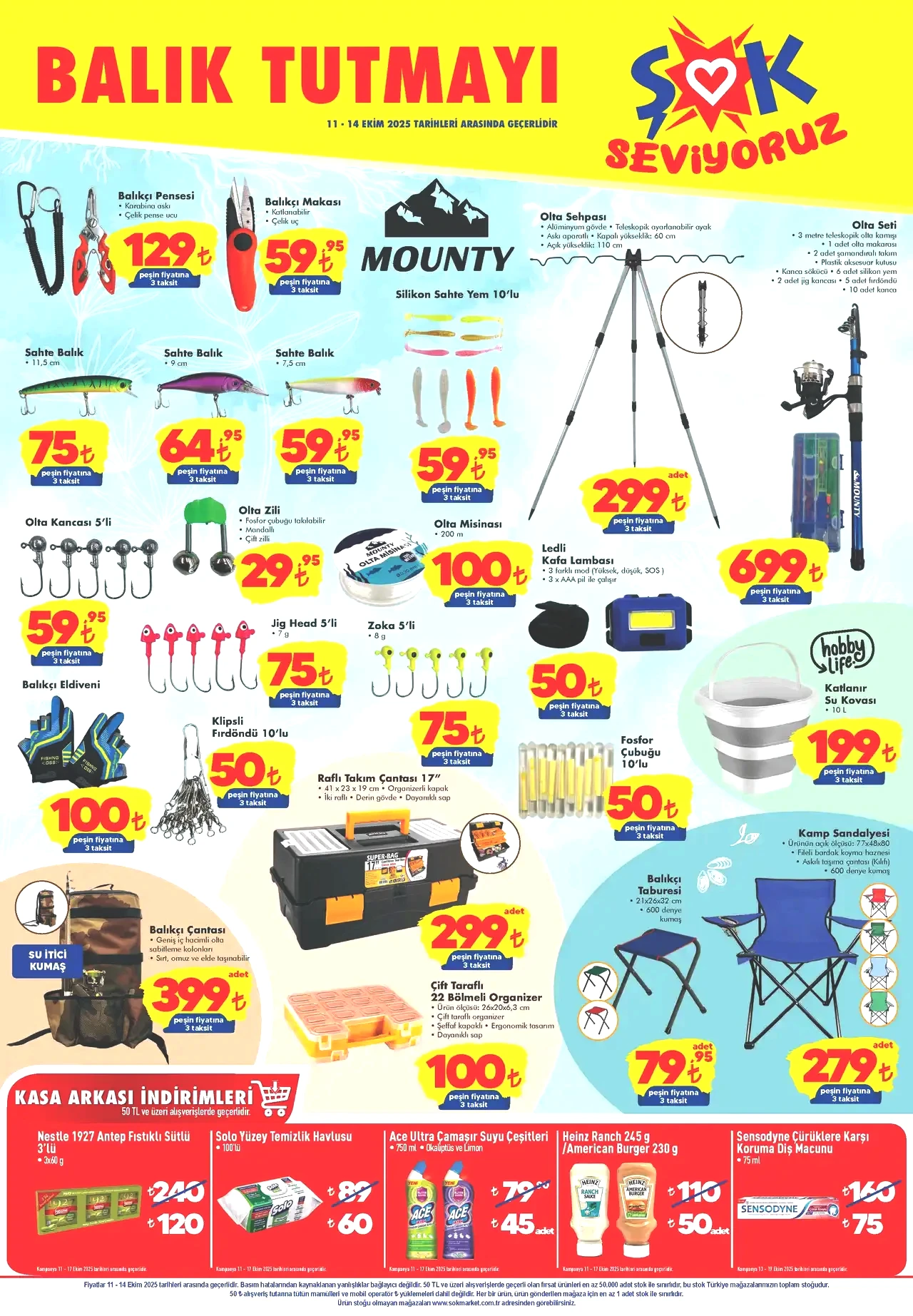 ŞOK Hafta Sonu kataloğu, üzerinde durulmaya değer iki etkileyici fırsat sayfasına ev sahipliği yapıyor. İlk sayfada, balıkçı ekipmanları alıcıları karşılamaya hazır. 11 Ekim ile 14 Ekim 2025 tarihleri arasındaki indirim döneminde sunulan balık ürünleri şu şekilde sıralanıyor: Öncelikle Mounty markasına ait balıkçı pensesi, balıkçı makası, olta sehpası ve olta seti dikkat çekiyor. Aynı markadan gelen ürün yelpazesine, üç farklı boyutta sahte balık da dahil. Ayrıca, uygun fiyatlarla raflarda yer alan olta misinası, 5’li olta kancası, olta zili ve balıkçı eldiveni gibi ürünler de bulunuyor. Fosfor çubuğu ise 50 TL’den 10’lu paketler halinde satışa sunulmuş. Balıkçı çantası için belirlenen fiyat ise 399 TL. Katlanabilir su kovası, balıkçı taburesi ve kamp sandalyesi gibi ürünler de Şok Aktüel ile 11 Ekim Cumartesi günü tüketicileri bekliyor. Ayrıca, raflı takım çantası 17” için 299 TL ve çift taraflı 22 bölmeli organizer 100 TL’den satışta. Balıkçı ürünlerinin yanı sıra, kasa arkası özel indirimlerle 5 farklı ürün geliştirilmiş. Şok 11 Ekim 2025 kataloğunda çikolata, temizlik havlusu, çamaşır suyu, sos ve diş macunu gibi ürünler bu fırsatları değerlendirenler için cazip hale geliyor.